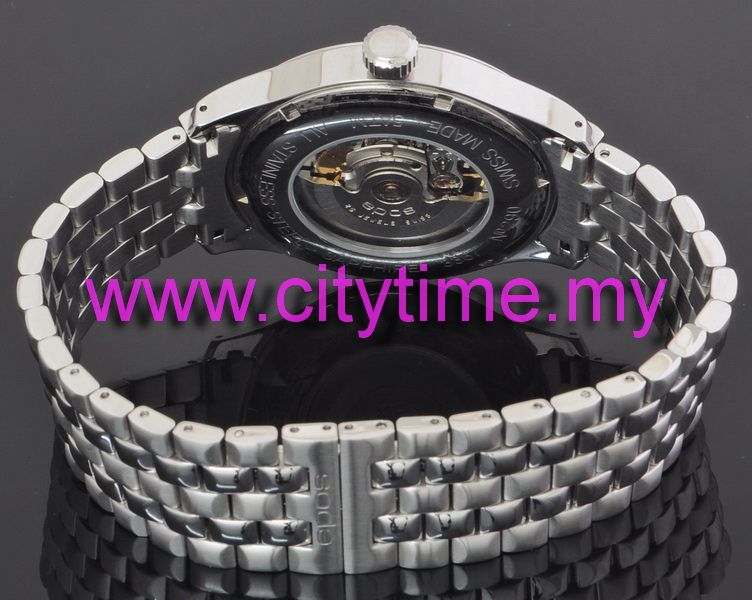 Mechanical self-winding movement ETA 2824-2 or SW 200, decorated. Calendar. Stainless steel case with sapphire crystal and screwed see through back. Water resistant to 50 m. Black dial with applied indexes.steel bracelet.
